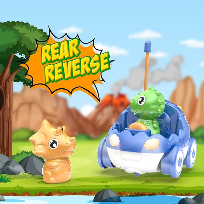 - The first RC car for your child - Suitable for kids over 18 months old to play, remote control car Dinosaur eggs model design, single frequency control specially designed, can be operated to run together without interfering with each other. Large buttons designed for 2 year old boy birthday gift, forward and left backward, easy to operate, the tire friction design of the remote control car is specially designed to drive smoothly on the carpet of the living room bedroom
