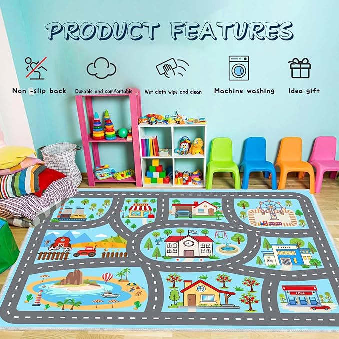 - 【Great Gift for Kids】This play rug is perfect for kids who like to play with wheel car toys, let boys and girls learn enlightenment while having fun, it is a good gift for kids.
