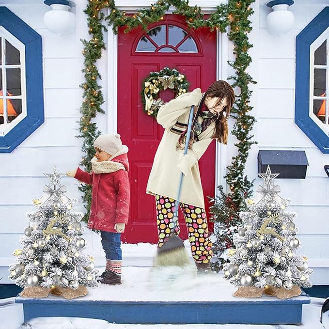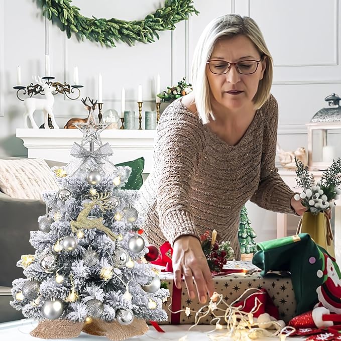 - 🎄Fullness & High Quality: Easy-to-fluff full branches to create the illusion of a full-bodied mini Christmas tree, the base adopts a weighted all-natural wood stake to make the small Christmas tree not easy to overturn. Package Includes: 24" Flocked Christmas Tree, 15 Decorative Balls, 1 Gold Fawn, 1 Silver Ribbon, 1 Star Tree Top, 10ft String Lights Powered by 2 AA batteries (not included)