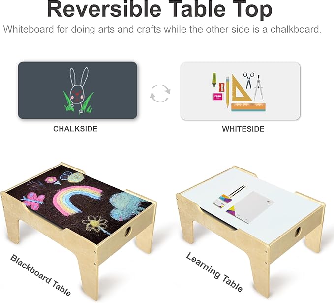 - 2 IN 1 REVERSIBLE TABLETOP:One side of the tabletop is Smooth whiteboard for doing arts and crafts and much more, while the other side is a chalk/blackboard.Therefore, this multifunctional kids playset can be easily switched between a activity table and chalk/blackboard table according to children’s needs.