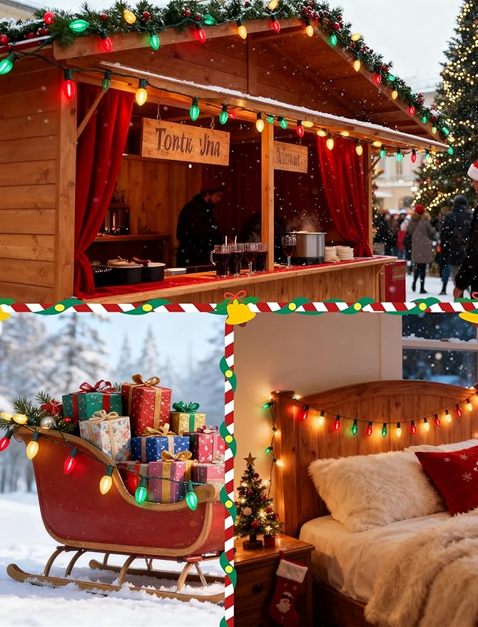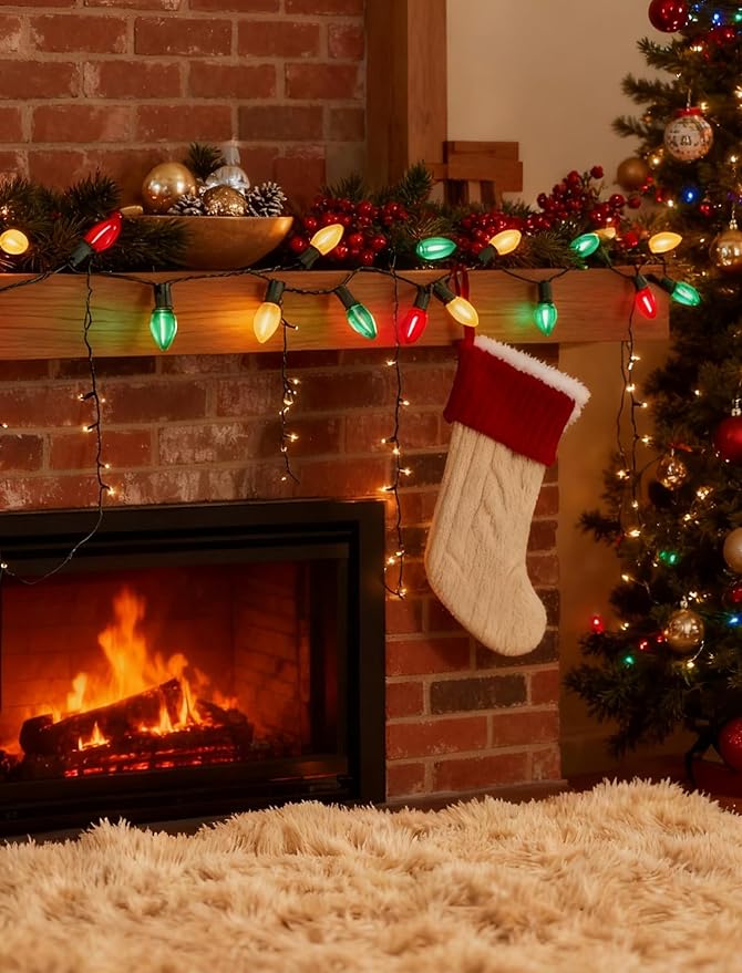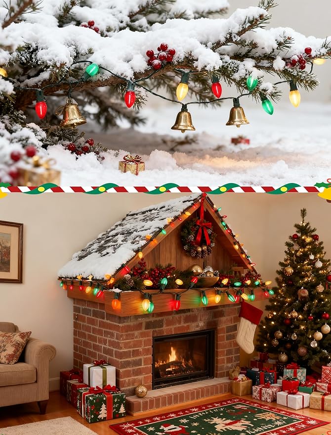 - 🌟 Versatile Application: C7 led Red white and green christmas decorations lights glow a warm white lights, vintage Christmas light string is dimmable, lights dimming requires a dimmer. c7 led christmas lights can be used both indoor and outdoor, such as the bedroom, bar, window, Christmas tree, party, wedding, window, holidays, festivals, shows, restaurants, hotels, shopping centers, patio, or porch, pathway, roofline decorations and lightings
