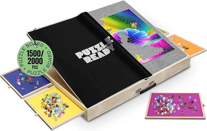 Puzzle Ready Puzzle Board with Tilting Drawers & Cover Mat - 1500-Piece Wooden Jigsaw Puzzle Table - 36″ x 27″ Portable Board with 3 Tilting Angles & Felt Working Surface