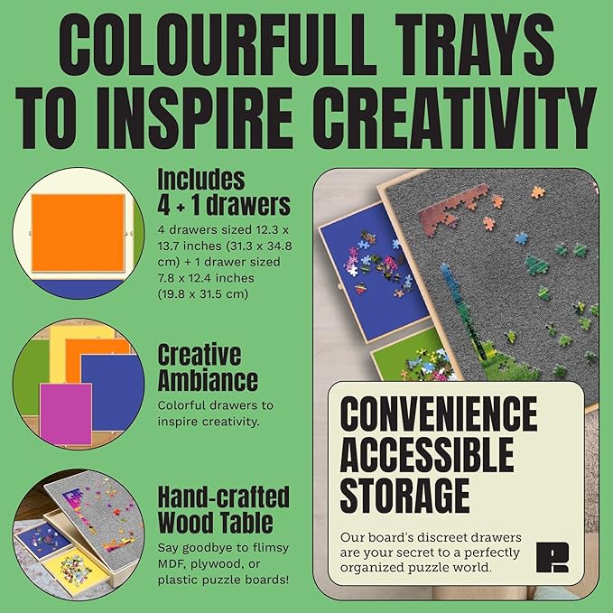 - Family Fun Jigsaw Puzzle Table: Meet your ultimate Puzzle Ready jigsaw puzzle board, featuring a sturdy build and soft felt surface for smooth puzzle assembly. This portable puzzle board with drawers lets you move your puzzles to a safe spot, perfect for enjoying with family and friends year after year, whilst ensuring easy puzzle storage