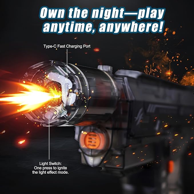 - Light-Up Muzzle & Scope: Blast in style with a glowing LED light that simulates real flame bursts, enhancing every shot. The built-in green dot sight helps you aim with precision, making it a hit for role-playing games or summer target practice. Great for both kids and adults who love tactical, immersive outdoor fun.