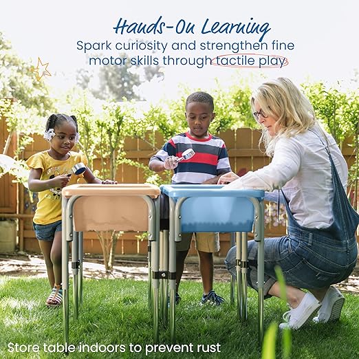 - Indoors and Outdoors: Play tables can be used in the backyard, outdoor play area, classroom, playroom; cover basins with secure lids to keep contents dry; bring tables inside to prevent rust
