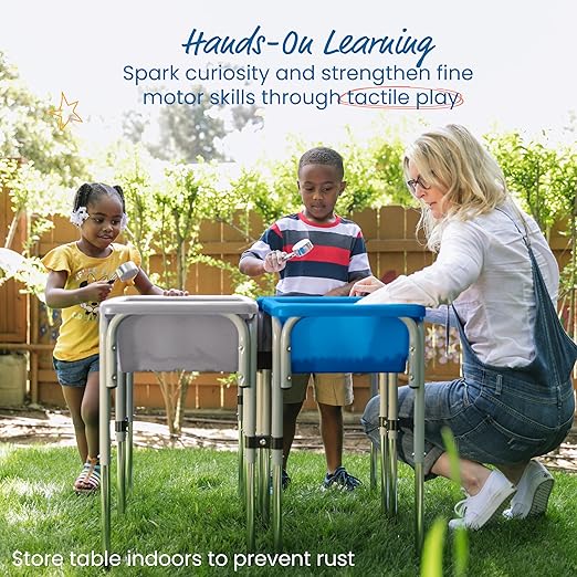 - Indoors and Outdoors: Play tables can be used in the backyard, outdoor play area, classroom, playroom; cover basins with secure lids to keep contents dry; bring tables inside to prevent rust