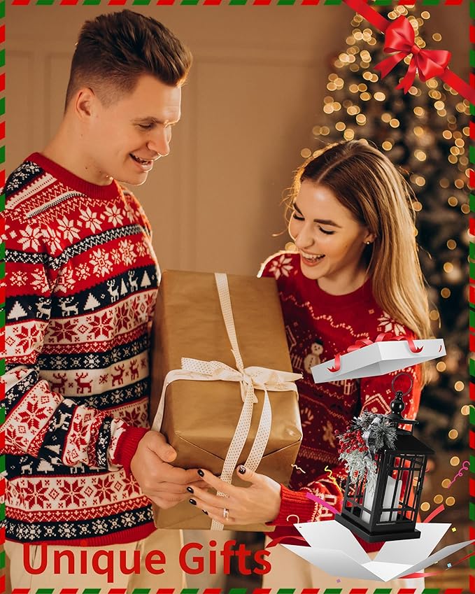 - Elegant and realistic design: This metal black lantern features a white candle inside that looks like a real flame. The lantern is decorated with a festive arrangement of red berries, green leaves, and pine cones on top.