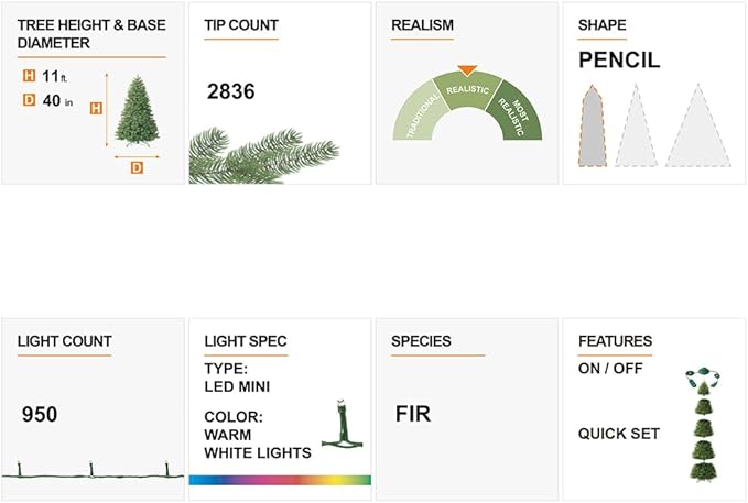 - 🎄【IDEAL SIZING】: The artificial Christmas tree stands 11 feet tall and 3.3 feet in diameter at the base. Elegant pencil fir without taking much space. Product may ship compressed -You can adjust all the branches with an elegant look like the images.