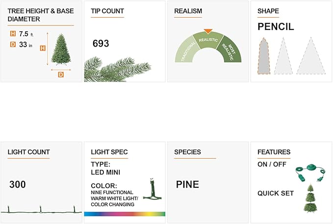- 🎄【NATURAL LIFELIKE APPEAL】: Our artificial branches look ultra-realistic and lifelike. With 693 individually crafted branch tips, including 208 pine needles and 485 PVC tips, pre-strung with 300 warm white/Multi-color LED light bulbs. This full bodied tree is as charming as the real thing.