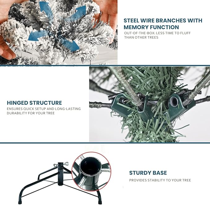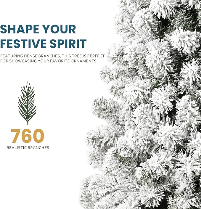 - Save Time:The hinged trunk of the snow Christmas tree drops automatically when setting up, and the steel wire branches quickly take shape. With 760 branches,it instantly looks full and fluffy, saving you 2-3 hours compared to traditional trees. Enjoy more time preparing holiday surprises with your family