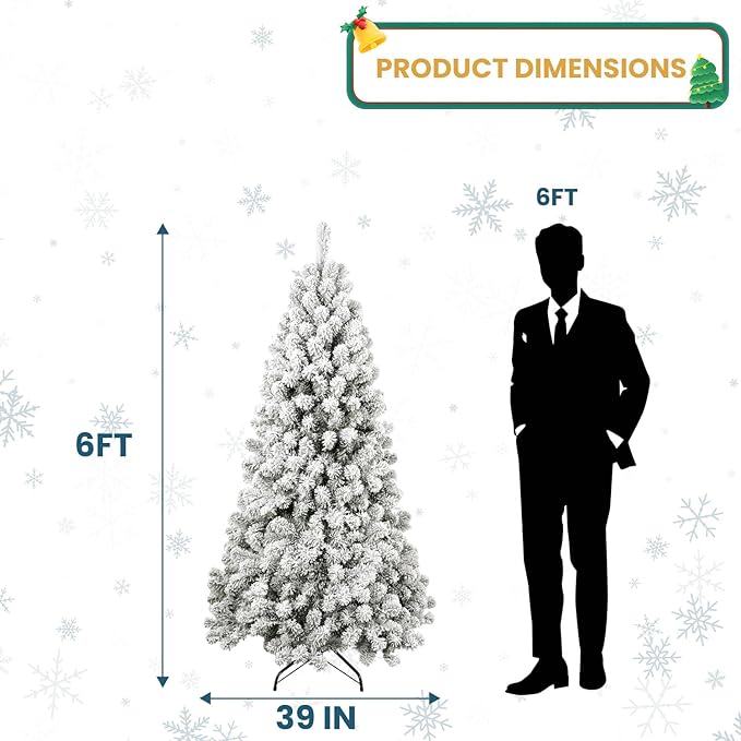 - Flocked Design: This 6ft flocked Christmas tree features meticulously designed snow-covered branches that mimic the look of a real fir tree, and it is odor-free. Its full and lush shape enhances the realistic appearance, adding a natural charm to your holiday decor