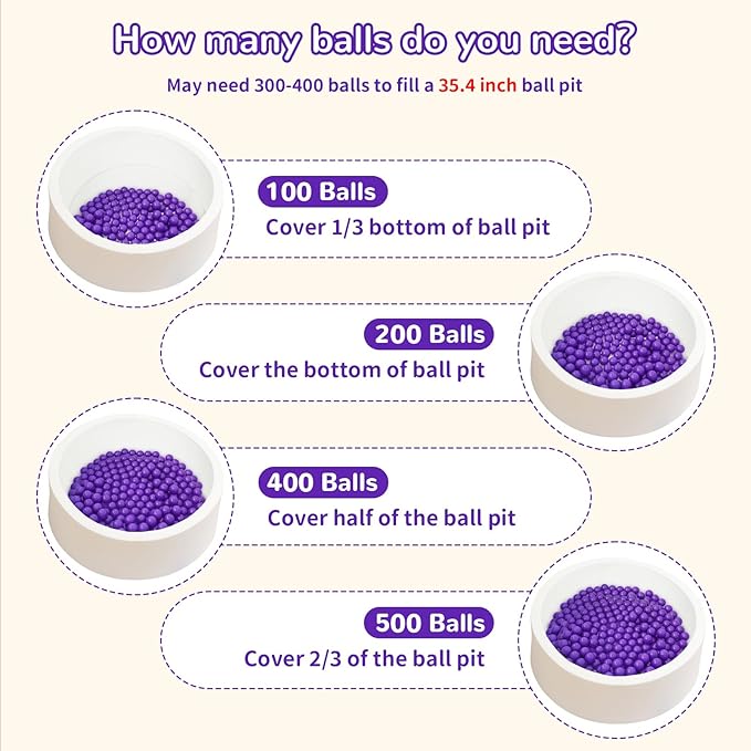 - DURABLE: Ball pit balls 100 per pack, ball pit balls 200 can cover the bottom of a 90cm ball pit, ball pit balls 500 can cover more than half of the ball pit; pit balls can withstand more than 0.14 ounces of weight and will not be crushed when children play