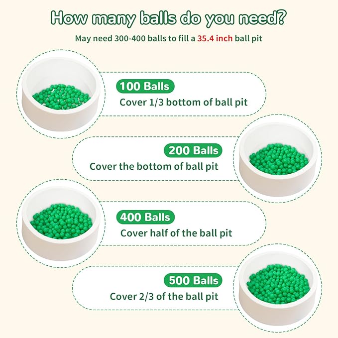 - DURABLE: Ball pit balls 100 per pack, ball pit balls 200 can cover the bottom of a 90cm ball pit, ball pit balls 500 can cover more than half of the ball pit; pit balls can withstand more than 0.14 ounces of weight and will not be crushed when children play
