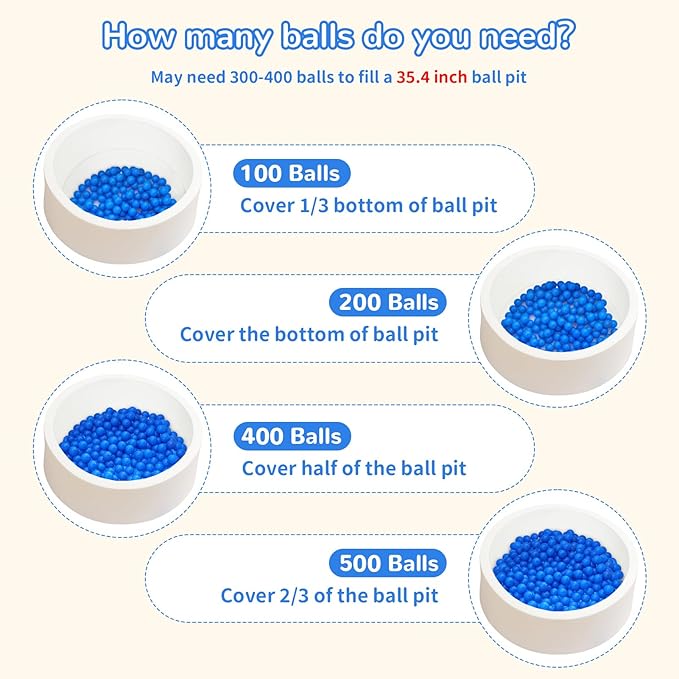 - DURABLE: Ball pit balls 100 per pack, ball pit balls 200 can cover the bottom of a 90cm ball pit, ball pit balls 500 can cover more than half of the ball pit; pit balls can withstand more than 0.14 ounces of weight and will not be crushed when children play