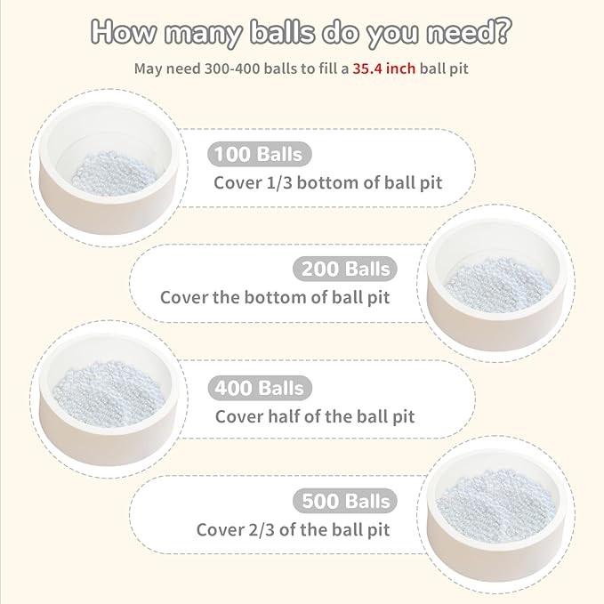 - DURABLE: Ball pit balls 100 per pack, ball pit balls 200 can cover the bottom of a 90cm ball pit, ball pit balls 500 can cover more than half of the ball pit; pit balls can withstand more than 0.14 ounces of weight and will not be crushed when children play