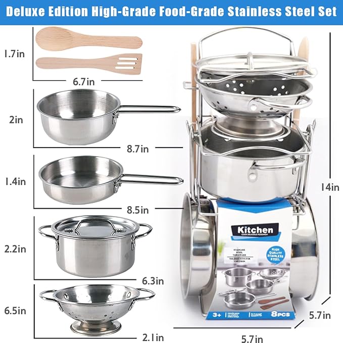 - 【Stainless Steel Cooking Set】The stainless steel pots & pans play set for kids including:2 pans,a soup pot with lid,a soup ladle,a frying ladle,a water filter dish,a kitchenware shelf,total 8pcs cookware set.