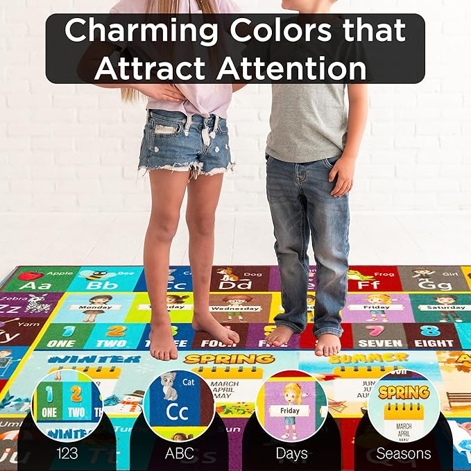 - MULTIPURPOSE TODDLER RUG: Ideal for classrooms, nurseries, or kids' bedrooms, this versatile baby floor mat doubles as an educational tool and a comfortable space for storytime, play, or alphabet familiarization.