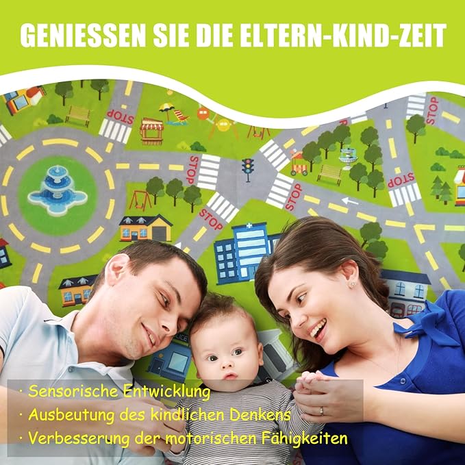 - 【Non-Slip Kids Playroom Rug】 We've upgraded the material of the car play rug - made of special yarn with dots on the bottom to enhance the non-slip performance. The entire playroom carpet is soft, non-slip and not easy to fade, and can withstand long-term use. Dirt and debris can be easily removed by wiping with a vacuum cleaner or a damp cloth, and machine washing can be thoroughly cleaned.