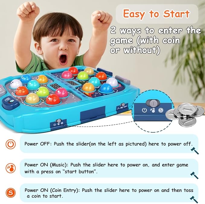 - Whack Game Mole With 3 Modes: ANNKIE "Pound A Mole" toy is an excellent tool for early childhood education and development.Includes 2 soft hammers, 18 colorful balls and 2 scoreboards for instant competitive play.With Three interactive modes(Solo, PK, & Super) Kids can challenge themselves with 9 speeds and 45 levels of increasing difficulty.Kids can challenge themselves for endless excitement.