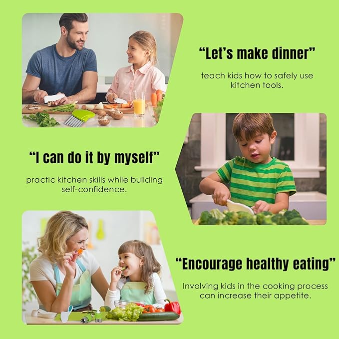 - 【GREAT GIFT FOR KIDS】Your kids will be eager to join you with this kids knife set in kitchen, children can cook in the kitchen with mother and encourage their creativity. You could even give them ingredients and let them create their own creations for the whole family to enjoy! Ideal gift for children's birthday Christmas, enjoy cooking time.