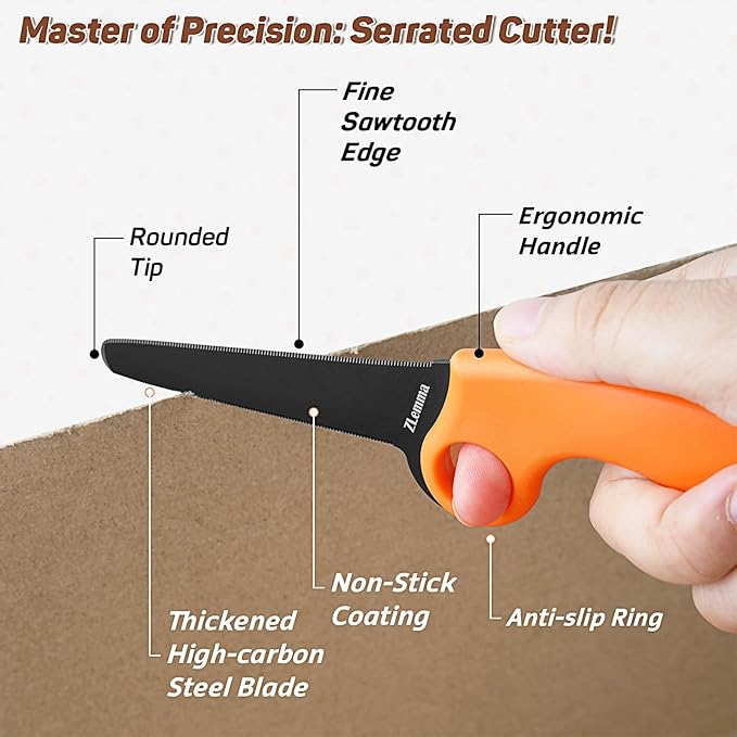 - 【Professional-Grade Cardboard Cutting Knife】 Inside the kit, you'll find a professional corrugated cardboard cutting knife equipped with precise serrations and a non-stick Teflon coating. This ensures impeccable cuts and long-lasting durability. Additionally, the knife features a finger-safe guard ring and an ergonomically designed non-slip handle for enhanced safety and ease of use.