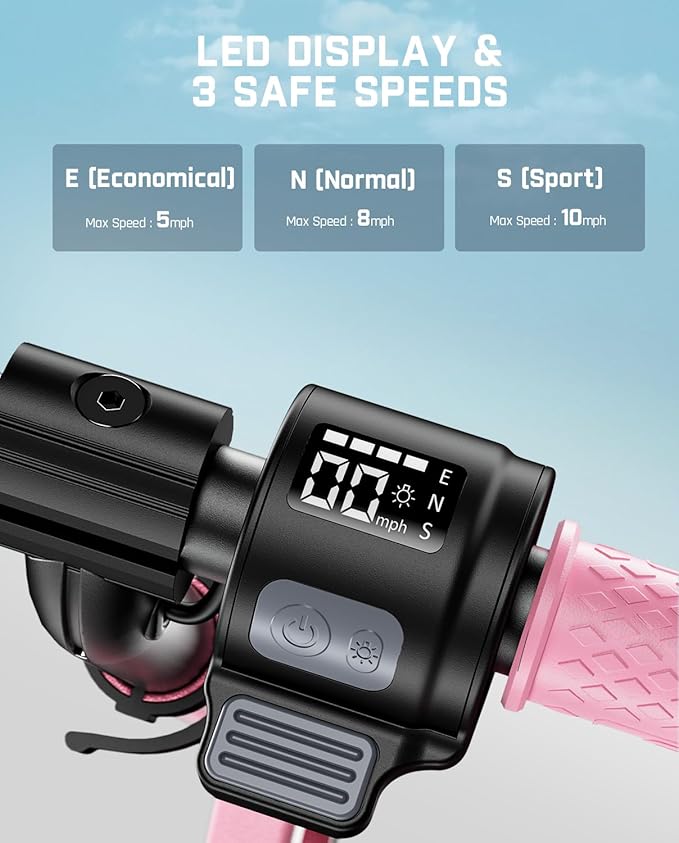 - Versatile Speed & Battery Display: The electric scooter for kids offers three speeds(5 mph/ 8 mph/ 10 mph) selections that are very suitable for children. The LED display shows the battery power, pedal mode, and riding speed at any time