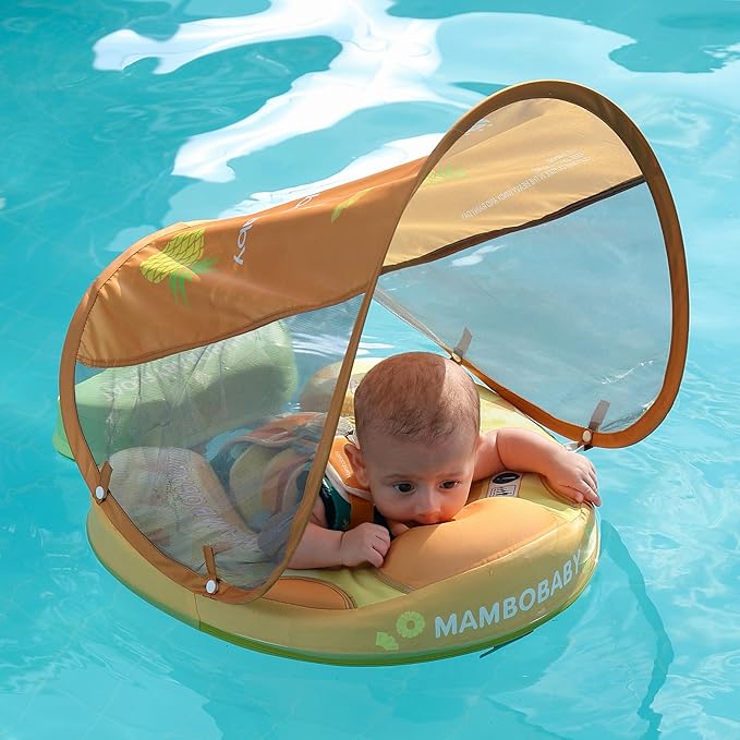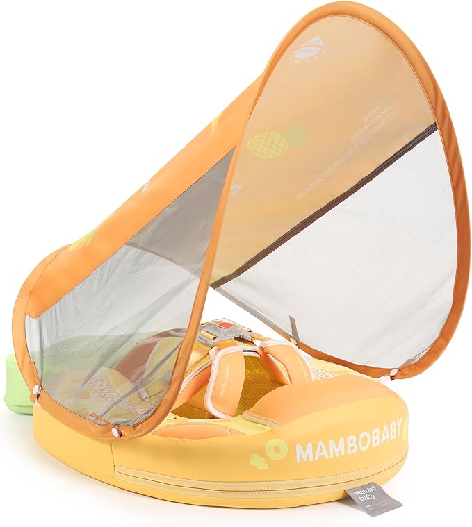 Mambobaby Float Add Tail Baby Swim Float with Canopy Solid Pool Infant Swim Trainer Swimming Training Lying Air Free Water Floats Non-Inflatable Waist Swim Ring for Toddlers (Pineapple)