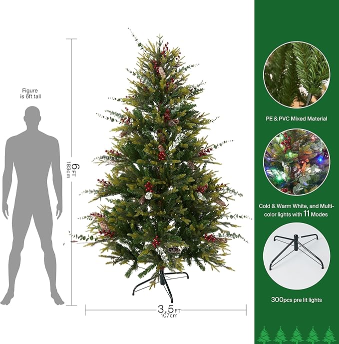 Artificial Christmas Tree with 300 Multi-Colored String Lights with 11 Modes, 6FT Prelit Christmas Tree with Red Berry and Pinecone, Xmas Tree with Foldable Stand Christmas Decorations Decor
