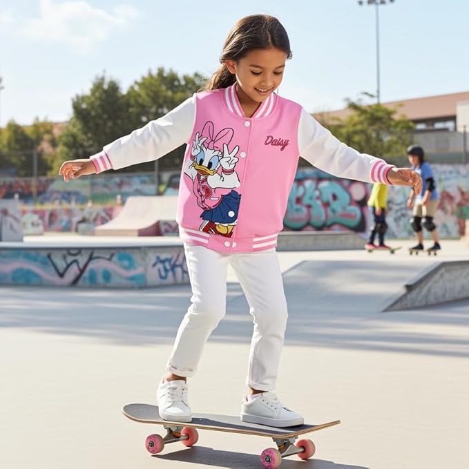 - Charming & Fun Design: Let your little one show off their Disney style with this adorable Daisy Duck varsity jacket! Featuring Daisy in a playful pose, this pink and white jacket combines sporty stripes with a fun, colorful look. The "Daisy" lettering adds a sweet touch. Perfect for kids aged 3-10, this jacket is ideal for casual play, school, or Disney-themed events, offering both comfort and style with Daisy's iconic charm