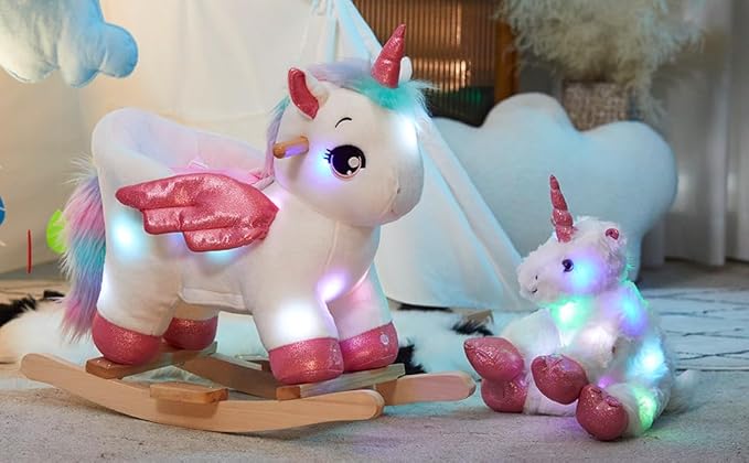 - Perfect Gift For Kids: The height of this wooden rocking horse fit kids up 1+ years old, one of the long-use toy gifts you want to give to kids. Your little one will enjoy hours with this wonderful plush Unicorn. Ride away to adventure with your new best friend!