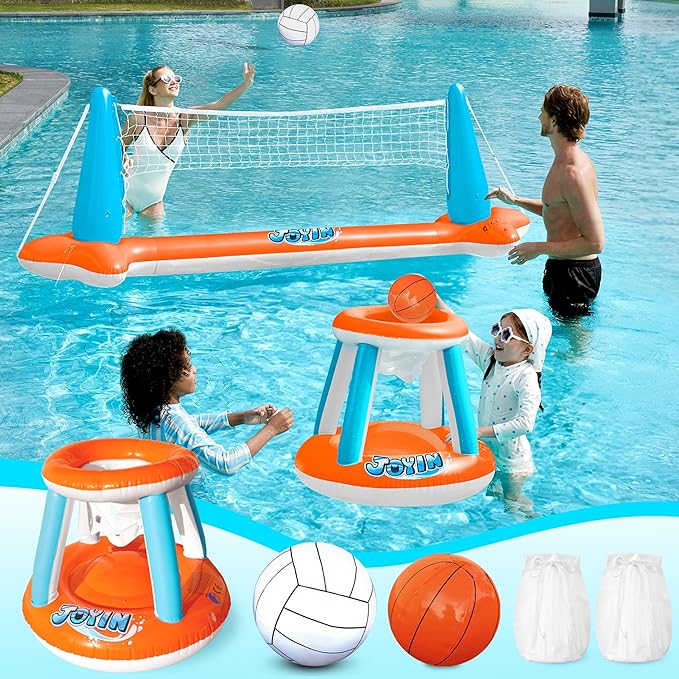 JOYIN XL Inflatable Pool Float Set, 125'' Volleyball Net & Basketball Hoops, Extra Large Floating Swimming Game Toy for Kids and Adults, Summer Floaties, Volleyball Court|Basketball, XL-Orange