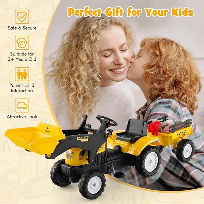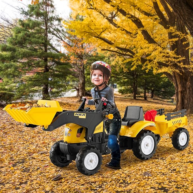Olakids Kids Ride on Excavator, Pedal Digger Car Bulldozer with Manual Control Bucket, Detachable Cargo Trailer, Shovel, Rake, 6 Wheels, Horn, Construction Tractor for Toddlers 3+