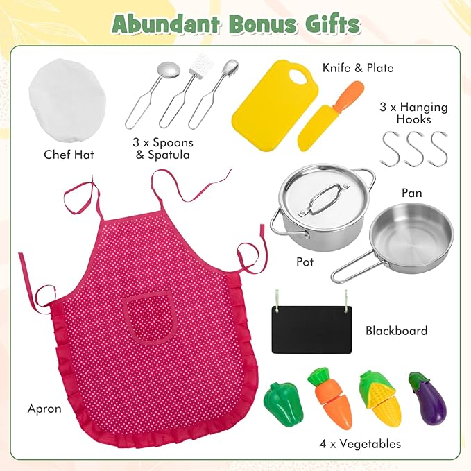 - 【17 Accessories Included】: This wooden play kitchen for kids comes with apron, chef hat, blackboard, pot, pan, knife & plate, 4 × vegetables, 3 × spoons & spatula and 3 × hanging hooks. Additionally, the ASTM and CPSIA certifications bring additional reliability.