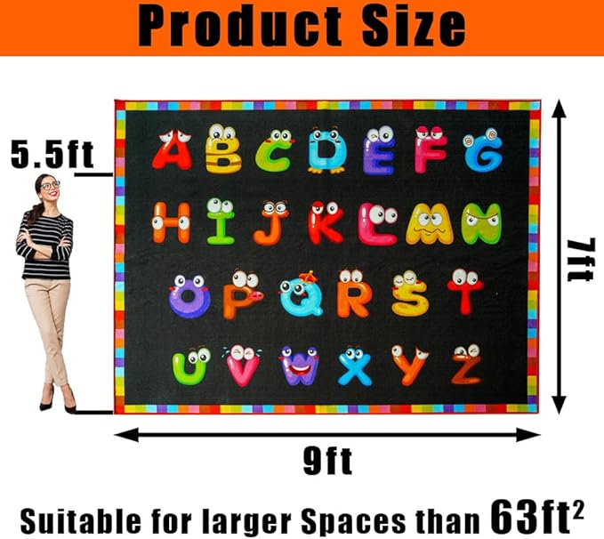 - Large Size: AlaTyche classroom rug is ideal for all classrooms! The full 6'7''x8'7'' provides a large enough area for children to learn and entertain. The cute alphabet design will provide the ideal teaching place for children!