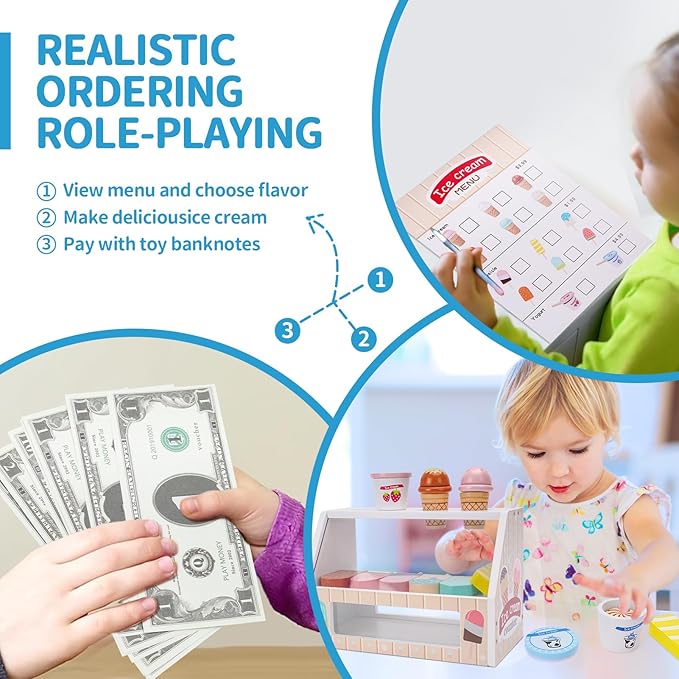 - 【All-in-one Ice Cream Counter Set】 The Wooden Scoop & Serve Ice Cream Counter includes a wooden ice cream counter, 6 flavors of ice cream cones, 6 kinds of colorful popsicles, 2 ice cream cups, 1 scooper, 2 wooden spoon, 10 pretend dollars, 10 coins, and a menu. All the accessories needed for an ice cream shop are included, so your child can start their 'business' whenever they want. Let your little one’s imagination soar!