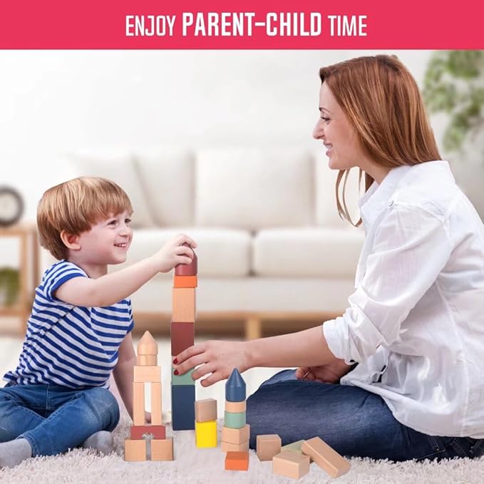 - Large Building Blocks Set : Bring the magic of building to your child's playtime with the Wooden Building Blocks Set! With 48 large wooden blocks, your toddler can let their imagination run wild as they create and build their own masterpieces,1 carry bag, package with box. Hardwood high quality and Non-toxic material, Wooden building blocks for toddler have always be an indispensable toy in the growth.