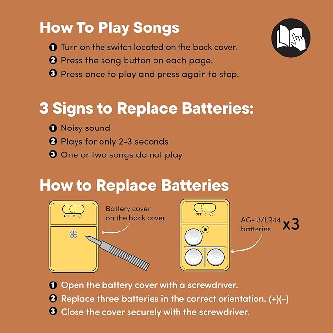 - MADE FOR LITTLE HANDS, LOVED BY PARENTS: Children can easily press the Play/Stop buttons on each page, while the volume control helps keep things quiet when needed. The soft-touch board book is thick and sturdy—perfect for toddlers to enjoy at home, on the go, or in the car.