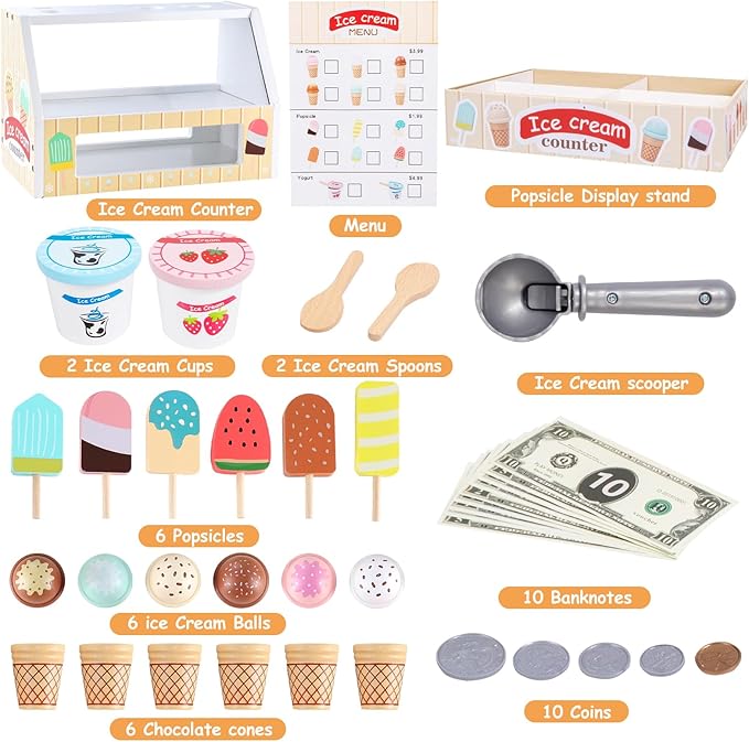 - 【Fun & Educational】This is an delightful ice cream counter for pretend play. The ordering process involving payment helps practice basic math concepts, such as counting, addition, subtraction and currency recognition. Keep your kids busy while they pretend a boss. Give kids an entertaining pretend play experience and an engaging option for screen-free fun.