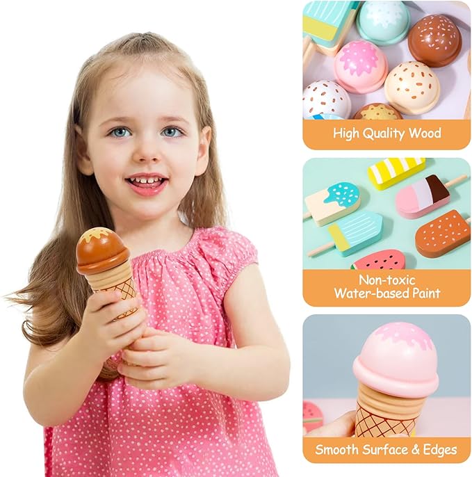 - 【Safe & Non-toxic】This ice cream counter set with non-toxic water paint is made of 100% solid wood and the edges of each part is well-rounded without any burrs for safe play.