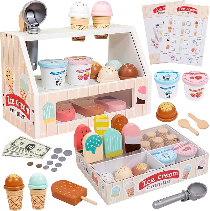 Wooden Ice Cream Set Counter Toy for Toddlers, Wooden Play Food Kitchen Accessories, Pretend Play Ice Cream Shop Toys for Kids Ages 3+, Play Store with Fake Money & Coin