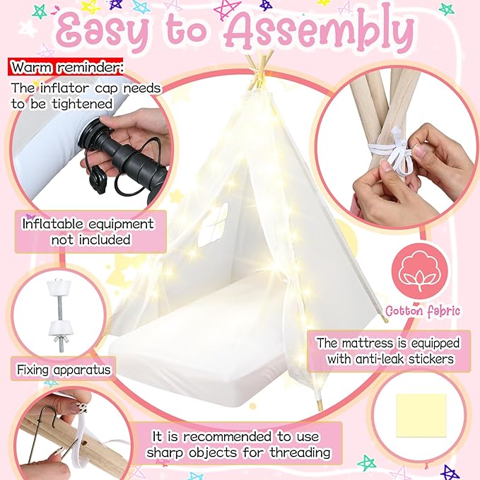 - Sturdy & Durable: made from quality cotton fabric, our machine-washable kids tent indoor is supported by solid pine poles for stability; The flocked air mattress inflates quickly, while the fitted sheet and star lights add extra comfort and charm