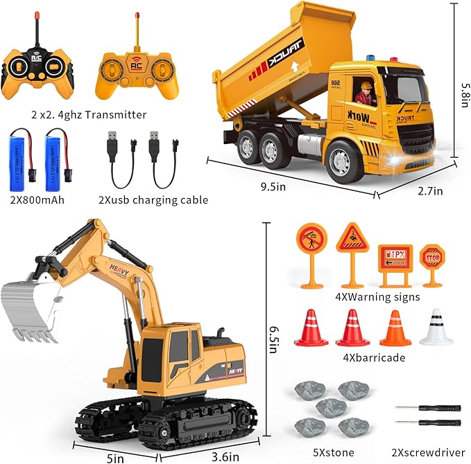 - 【SUPER VALUE PACK】Our RC Construction Vehicle Playset includes 1 RC Excavator and 1 RC Dump Truck. In addition, the set also includes 2 remote controls as well as four road signs, four barricades, and five simulated rocks.