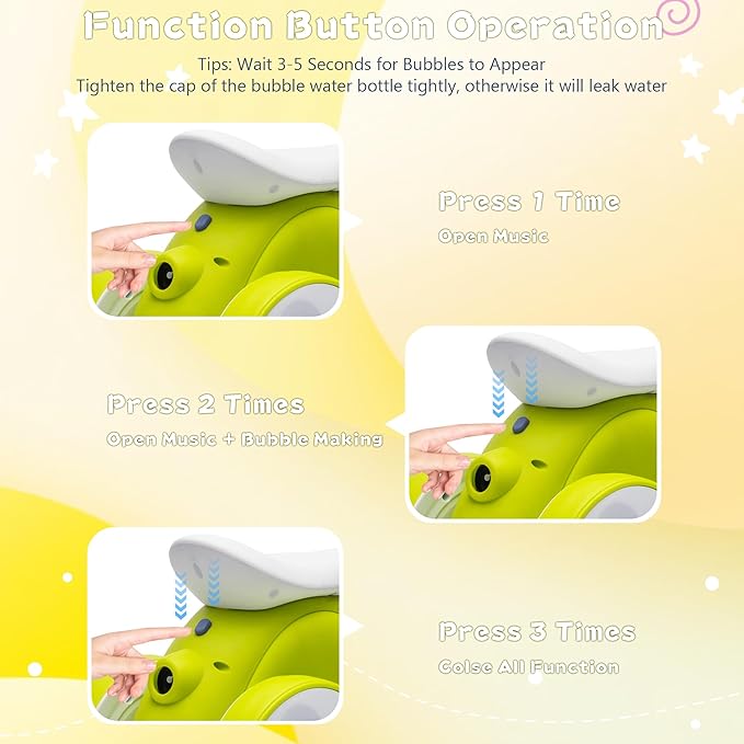 - Exciting Features for The Bubble Bike:The thoughtful design includes bubble devices, light effects, music functions, and whistles, adding more fun to the driving experience. Parents can ensure safe driving directions using the remote control. The use of plastic material instead of metal makes the ride-on toy lighter, more compact, and easy to store and carry. The non-slip, wear-resistant wheels are gentle on floors and allow the baby to ride indoors or outdoors.