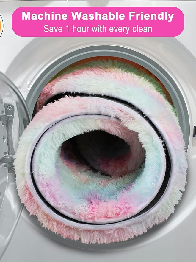 ONASAR Rainbow Round Area Rugs 5ft, Soft Bedroom Circle Rug Mats for Kids Girls Teen Room, Kawaii Fluffy Plush Shaggy Carpet for Dorm Nursery Living Room Playroom Home Decor Princess Castle
