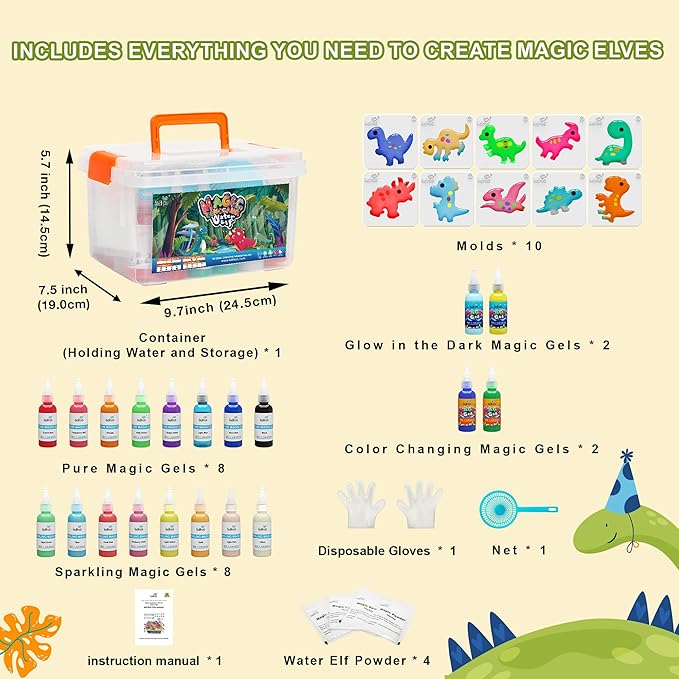 - Aqua Fairy Water Gel Kit:Designed with bright, eye-catching colors, the Magic Water Elf Kit is excellent for toddlers learning about colors. The variety of dinosaur molds enhances cognitive skills through shape and color recognition.