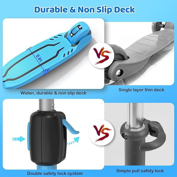 - 【Safe & Smooth Ride】The wide anti-slip double layer reinforced deck (5 inches) provides ample room for both sitting and standing. The 45mm widened rear wheel and brake offer superior grip, ensuring a safe and perfectly balanced ride for kids aged 3-12.