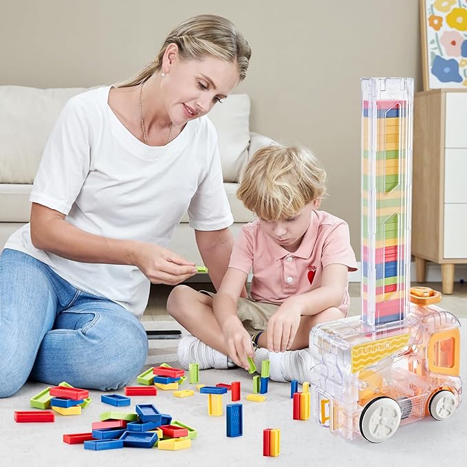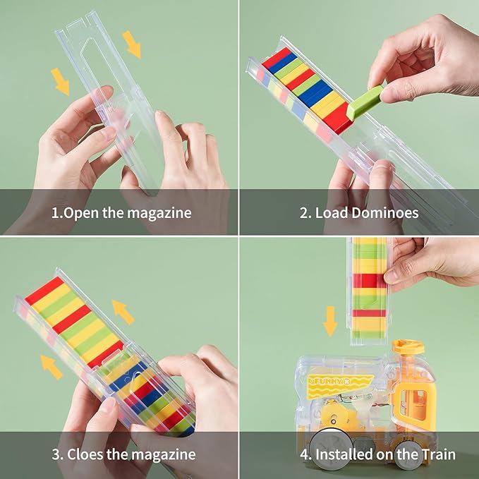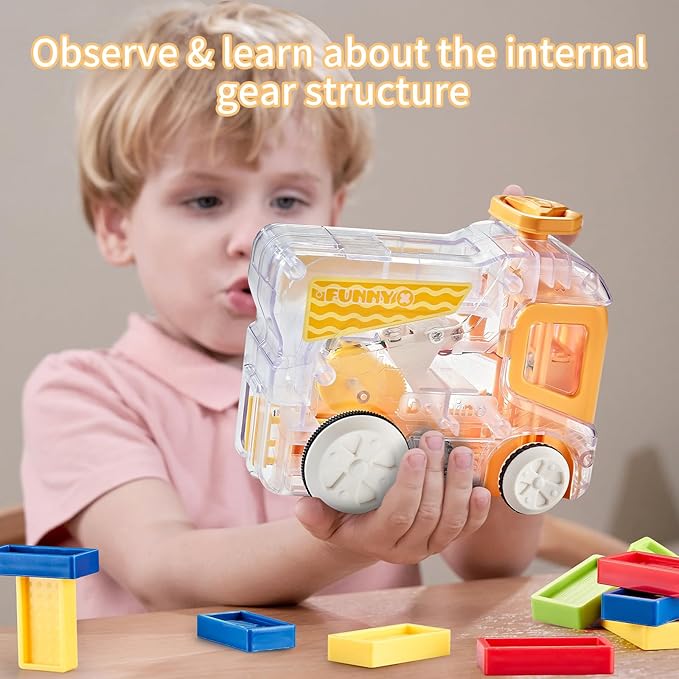 - 【Sensory Learning】This Upgraded Domino Train features a transparent shell design, allowing a clear observation of the internal gear mechanism. With the addition of warm yellow lights and crisp bell sounds, it not only enhances visual effects and auditory experiences but also provides an excellent learning opportunity for children to explore the gear operation mechanism.