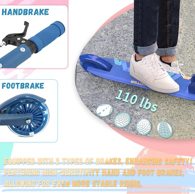 - New Handbrake Design: Our scooter is equipped with both a handbrake and a foot brake, providing enhanced safety. With the handbrake, your child can easily stop whenever needed, while the wide anti-slip deck ensures maximum stability.