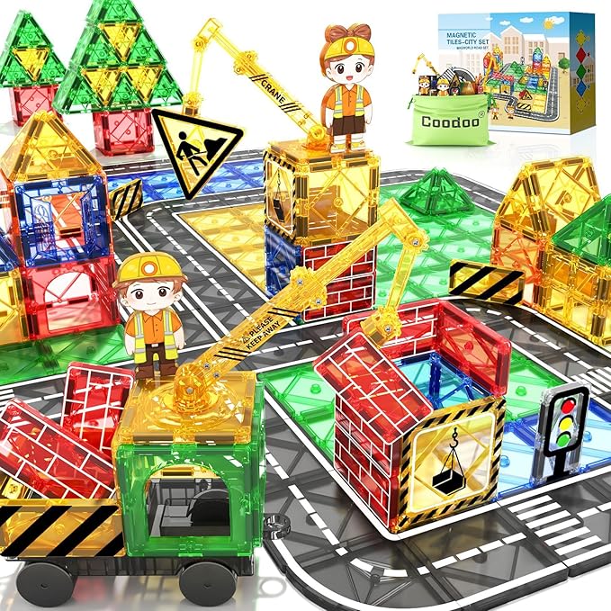 - IMMERSIVE CITY BUILDING EXPERIENCE: Discover the building experience with our 40-piece magnetic tiles road set! This kid's toy set includes 17 traditional magnetic tiles, 10 traffic roads, 2 warning tiles, 2 wall tiles, 2 construction signs, 1 traffic light, 1 crane, 1 car, 2 figures and 2 window blocks. Diverse pieces allow kids to unleash their imaginations and create dynamic building experiences. Get ready for hours of fun as your child embarks on an exciting city-building adventure