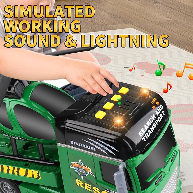 • 【3 IN 1 TODDLER CONSTRUCTION TRUCKS SET】:The toddler boy army toys includes a extra-long transport trucks and helicopts,dinosaurs,comes with the flashing lights and makes various traffic horn sounds,inertial power,the joints of the toy are very flexible.Need 6*1.5V LR44 batteries(include).